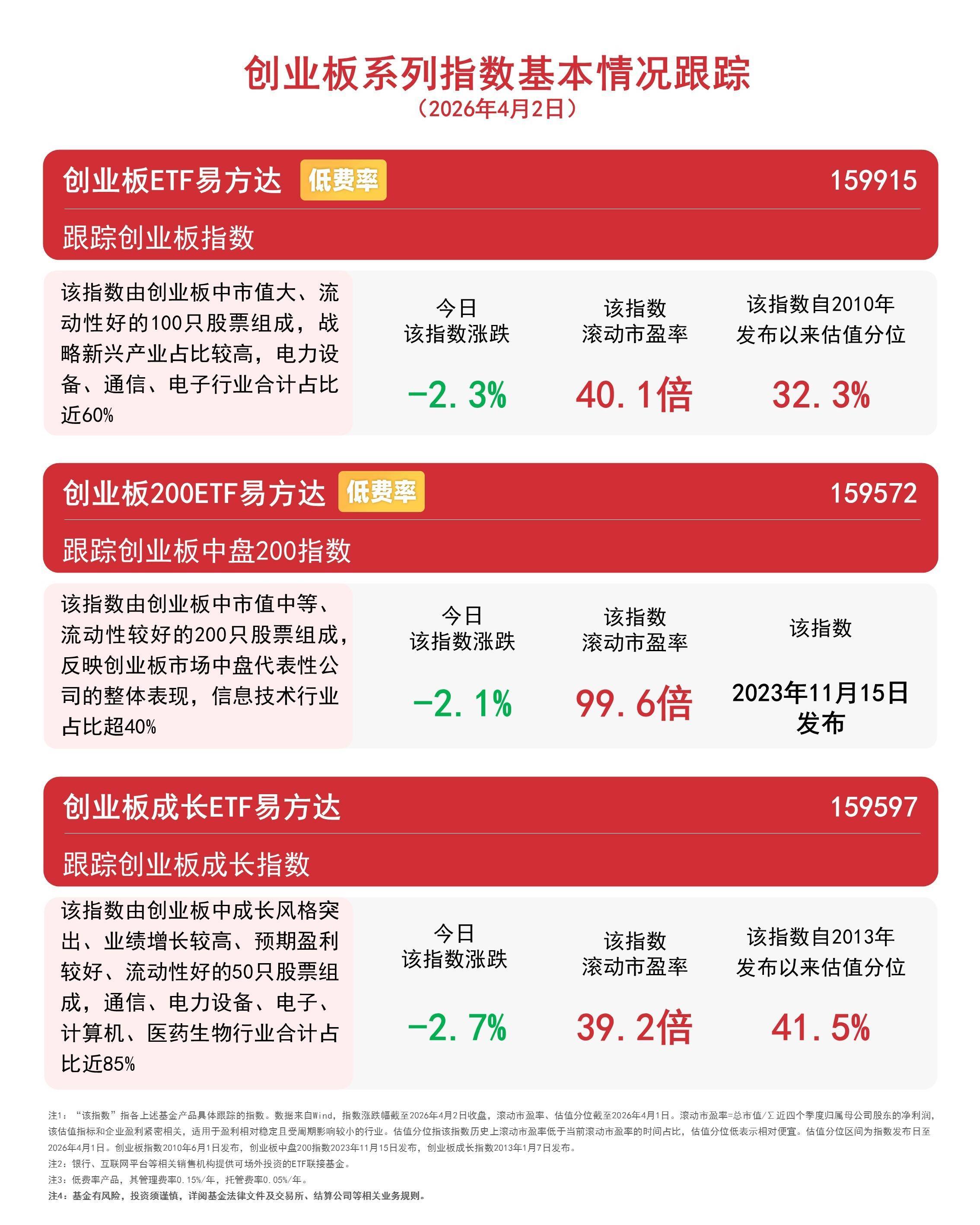 截至收盘,创业板中盘200指数下跌2.1%,创业板指数下跌2.3%,创业板成长指数下跌2.7%,创业板ETF易方达(159915,联接基金A/C/Y:110026/004744/022907)今日净申购达1.4亿份。